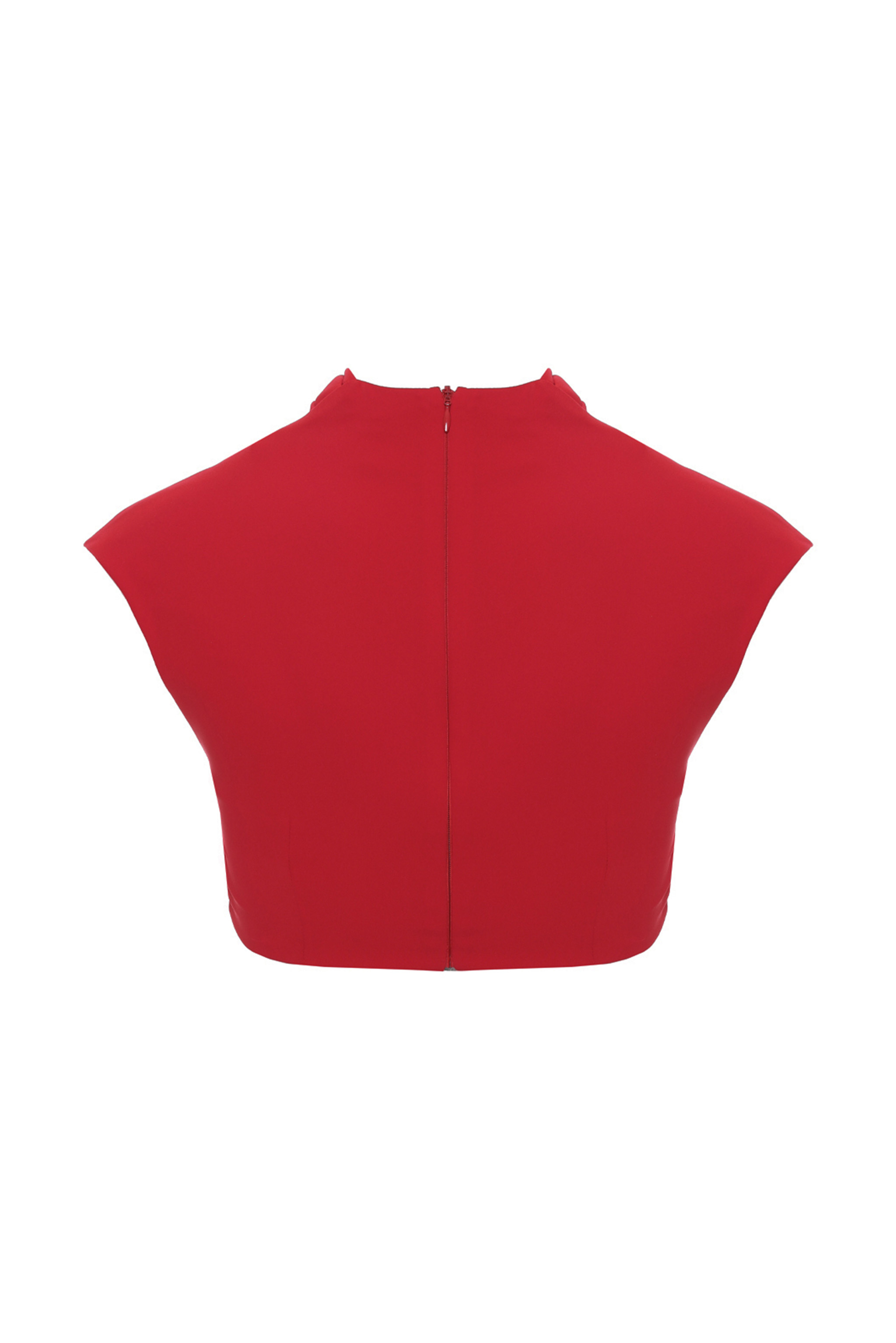 Кроп-топ ярко-алого цвета с декоративным горлом в форме шейного платка – эффектная деталь в гардеробе, гармонирующая с брюками, джинсами и юбками, и отлично играющая в паре с классическими офисными пиджаками и жакетами. Модель имеет удобную молнию на спине.