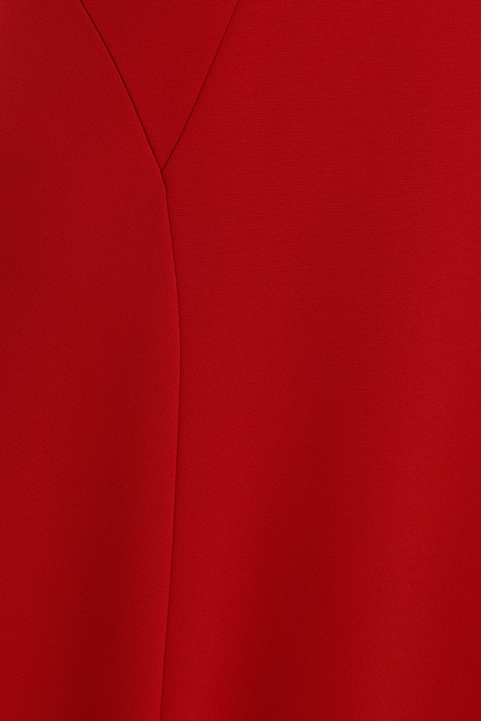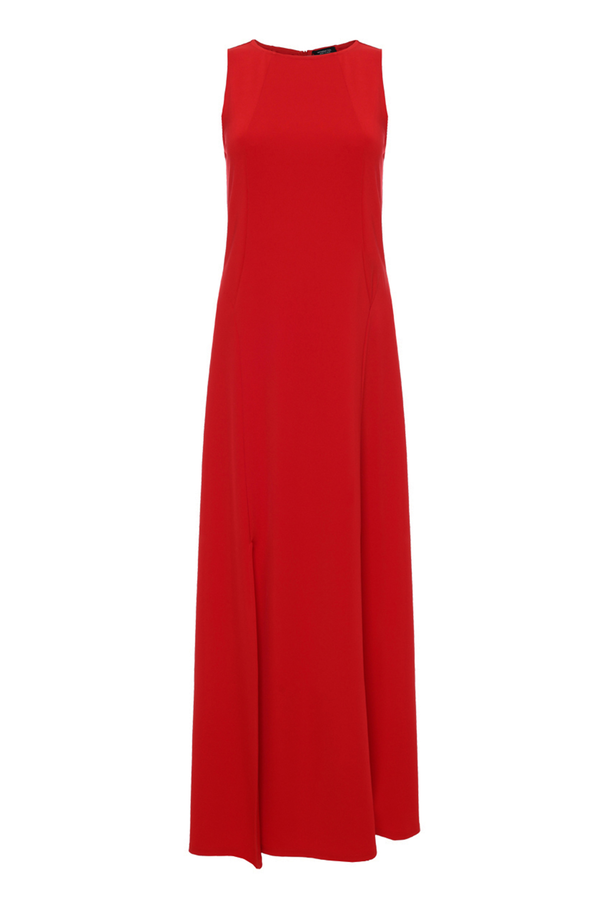 Платье из плотного трикотажа роскошного алого цвета с эффектным разрезом спереди – особая модель осенней коллекции. Расклешенное к низу и струящееся по телу, платье идеально подходит как для страстных свиданий и выходов в свет, так и для офиса, комбинируя его с классическим пиджаком. Модель макси будет отлично смотреть как на прямом ходу, так и на небольшом каблуке.