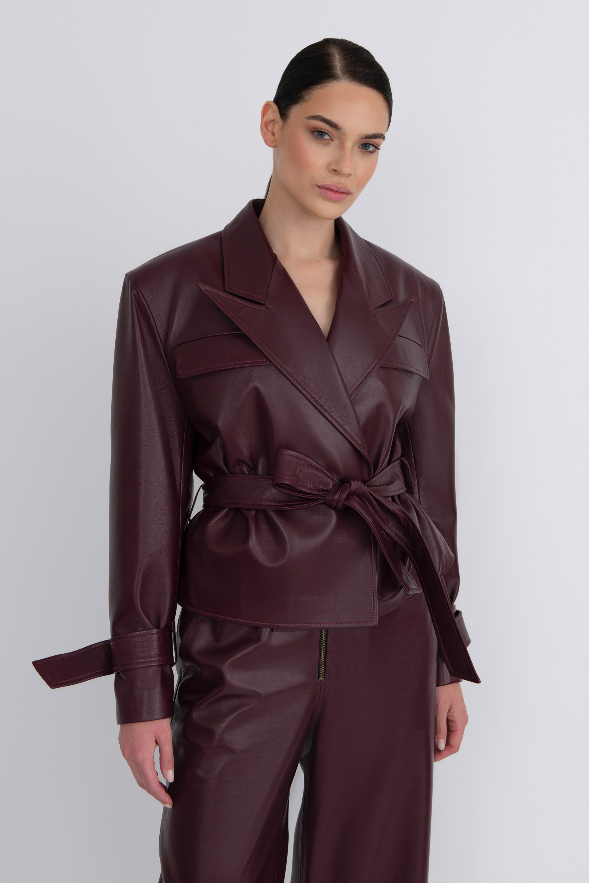Один из главных хитов коллекции - жакет из гладкой натуральной кожи премиального качества с подплечниками ультра модного силуэта. Жакет выполнен в трендовом винном цвете, благодаря которому изделие впишется в любой гардероб. Сочетание с природными оттенками выгодно выделит образ и сделает его максимально эффектным. Жакет имеет пояс и съемные ремни с обтянутыми кожей пряжками на манжетах рукавов.